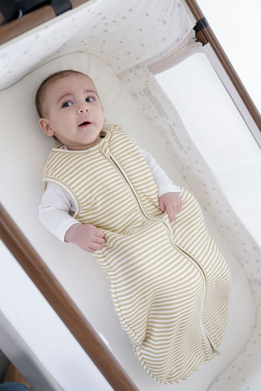 החלק התחתון של שק השינה שלנו עשוי בדים גמישים ומעוצב בצורת פעמון על מנת לאפשר לתינוק לנוע בחופשיות ולהישאר בנוחות מקסימלית בזמן השינה. ללא שרוולים לויסות חום אידאלי.