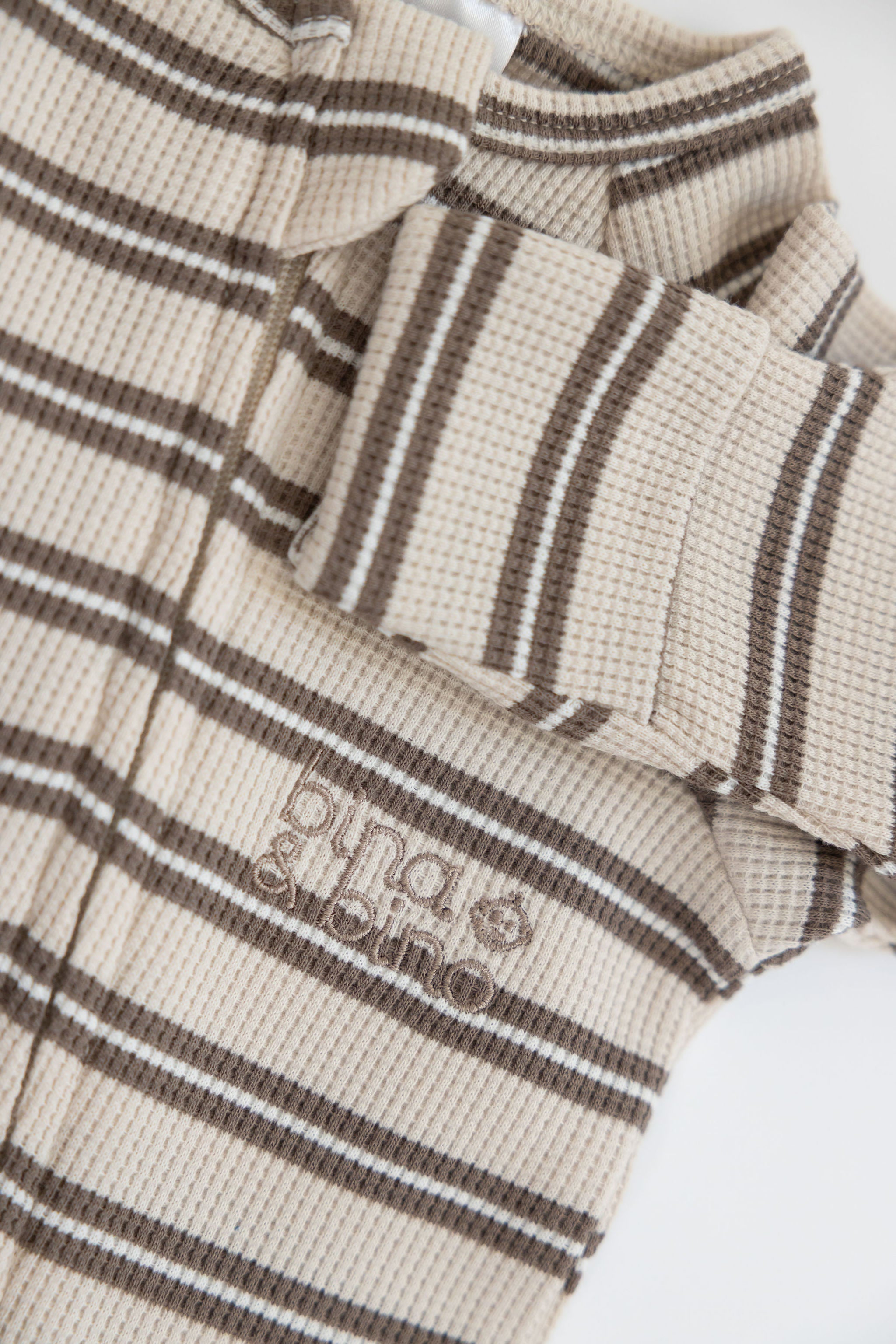 בד וופל רך, נעים והכי מגניב ומושלם לעונת המעבר. כשמתקרר ניתן להוסיף בגד גוף מתחת לחימום נוסף. 95% כותנה, 5% אלסטן. שטיפת במכונה קרה. יש להפוך את הבגד בעת כניסה למכונה. מומלץ לא להכניס למייבש. לקבלת מידע נוסף, יש לעיין בתווית הבגד