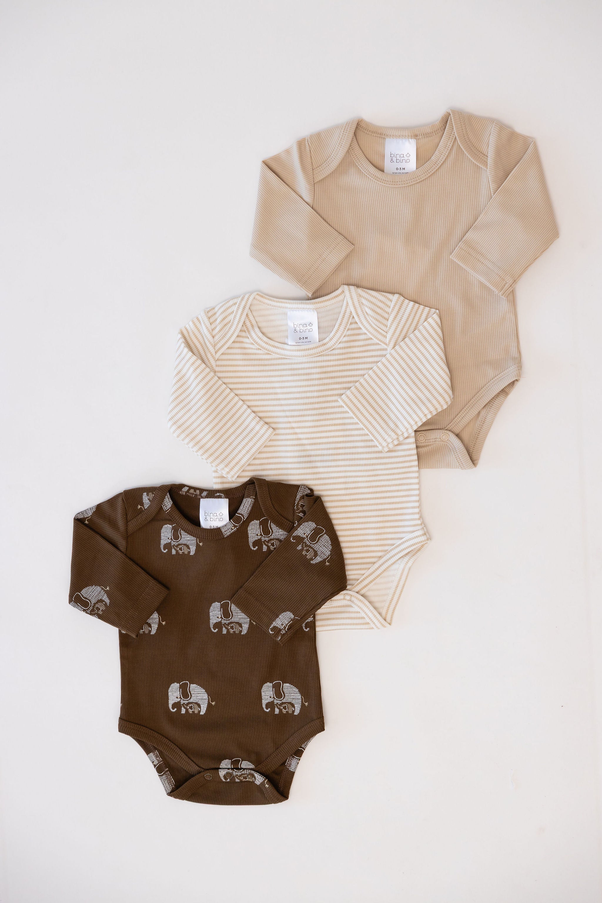 מארז 3 בגדי גוף מבד ריב // SAND + SAND STRIPE + ELEPHANT MAMA